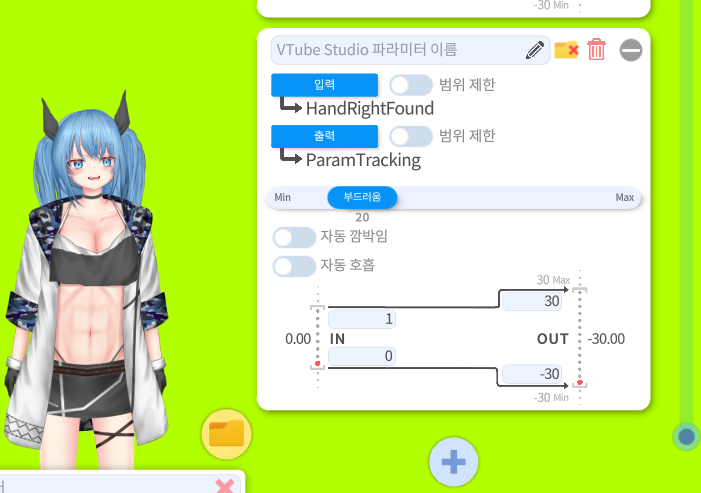 - "출력"에 원하는 움직임 대상 파츠("Hand"관련) 을 추가한다. (핸드트랙킹이 있는 모델이면 "HandTracking" 항목이 있으니, 이를 "Hand Found" 를 입력으로 해서 설정)