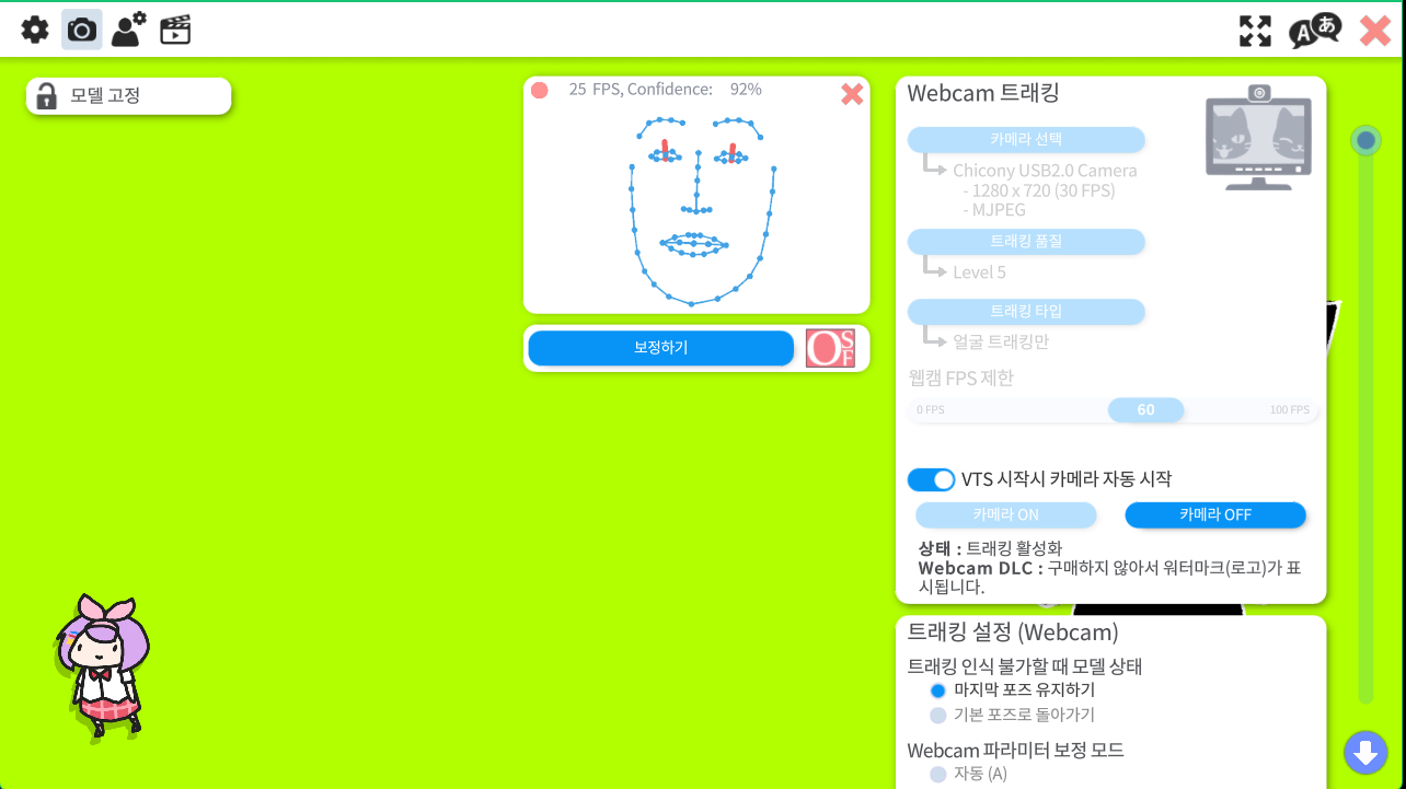 2) "Webcam 트래킹" 에서 "카메라 선택" 부분을 본인 카메라에 맞게 설정.