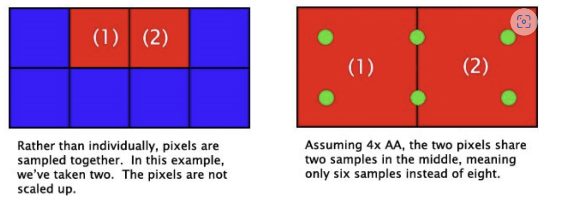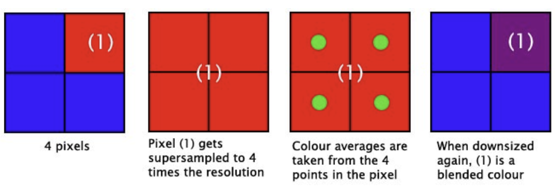 - 후면 버퍼와 깊이 버퍼를 화면 해상도보다 4배 (가로 2, 세로2) 크게 잡고, 렌더링. -> 제시할 떄, 버퍼를 원래 크기로 환원(resolving)