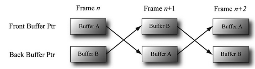 - 후면 버퍼가 완전히 렌더링 되면, 후면 버퍼와 전면 버퍼의 역할이 서로 바뀜
